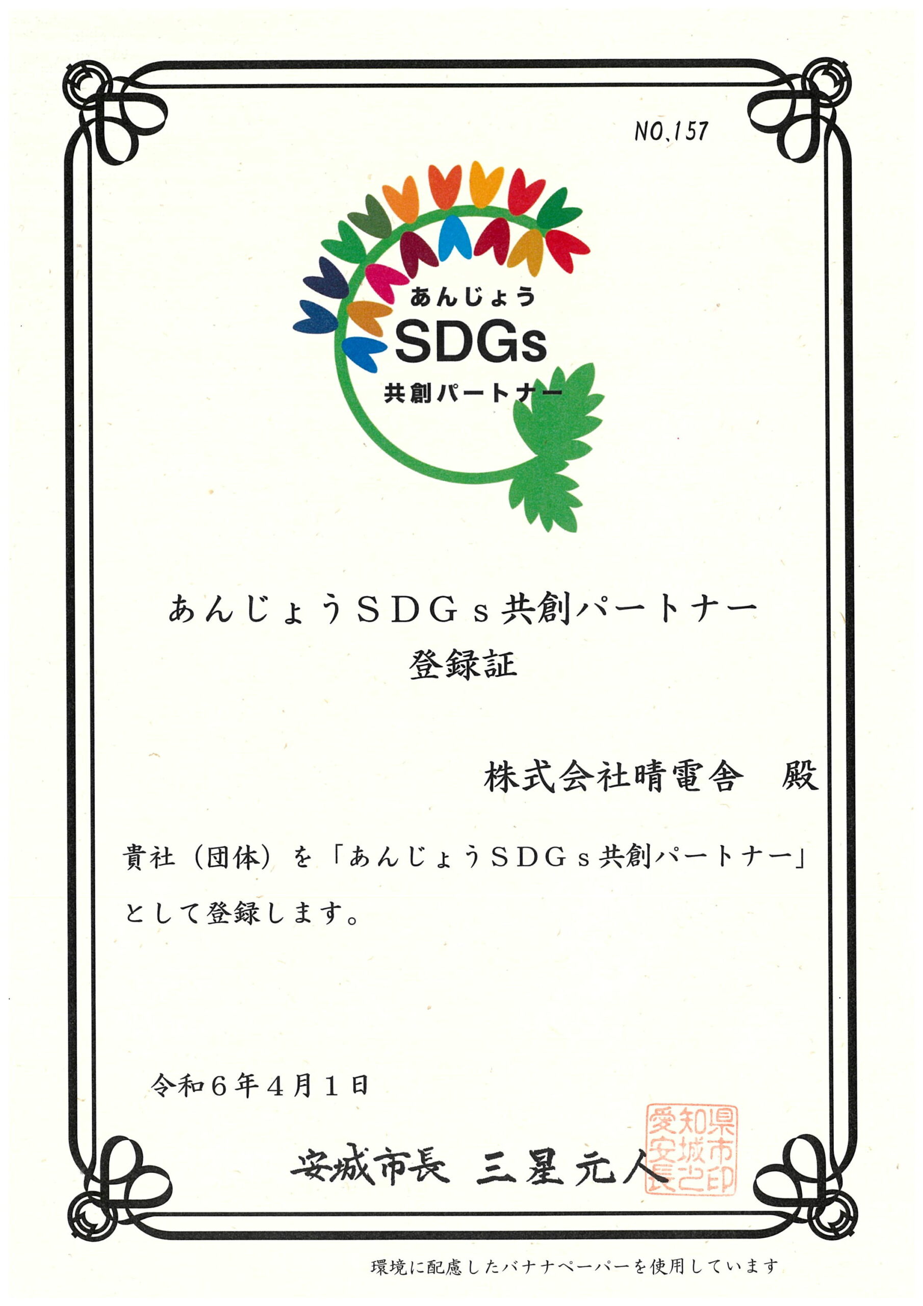 愛知県SDGs登録制度『あいちSDGsパートナーズ』登録証